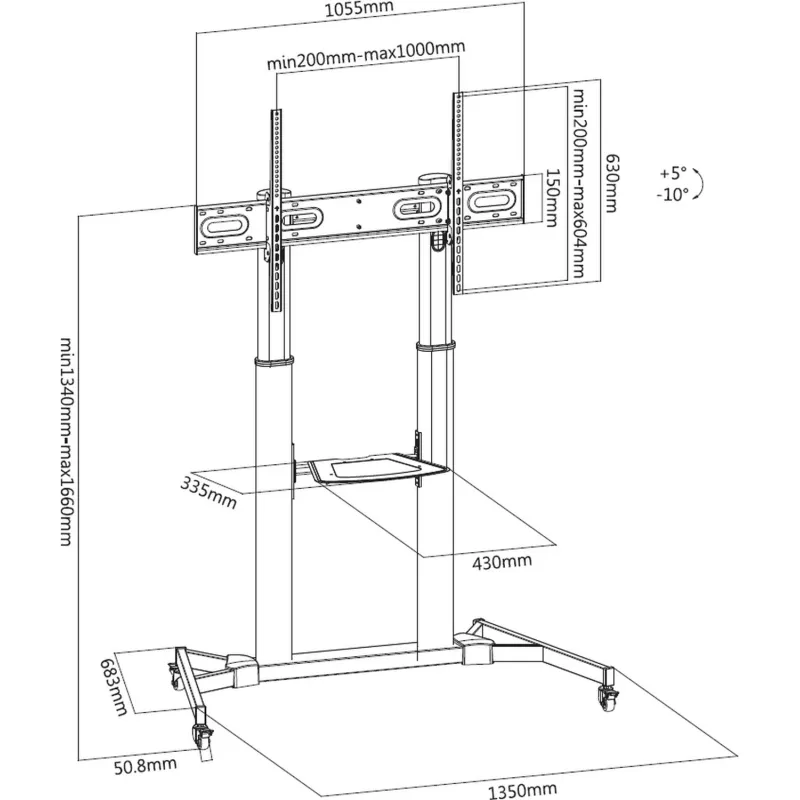Мощная мобильная стойка для ТВ и панелей с максимальным VESA 1000×600 для крупногабаритных и тяжелых панелей и ТВ диагональю 55-100 дюймов до 100 кг.