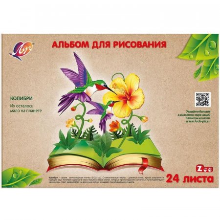 Альбом на склейке, формат А4 (210x297 мм). Обложка из высококачественного целлюлозного картона плотностью 190 г/кв.м. Внутренний блок из офсетной бумаги плотностью 100 г/кв.м из 24 листов. На оборотной стороне альбомамастер-класс по рисованию. Альбомы подойдут как для различных красок на водной основе, так и для карандашей, ручек, угля, мягкой и масляной пастели и других сухих материалов.