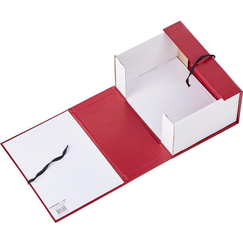 Складной архивный короб Attache формата А4 изготовлен из переплетного картона, снаружи покрыт бумвинилом красного цвета (материал на основе ПВХ). В закрытом виде фиксируется с помощью двух хлопчатобумажных завязок. Внутренние стойки-упоры выполнены из гофрокартона. Короб вмещает до 1500 листов стандартной плотности, ширина корешка — 15 см. Позволяет надежно хранить документы как в вертикальном, так и в горизонтальном положении
