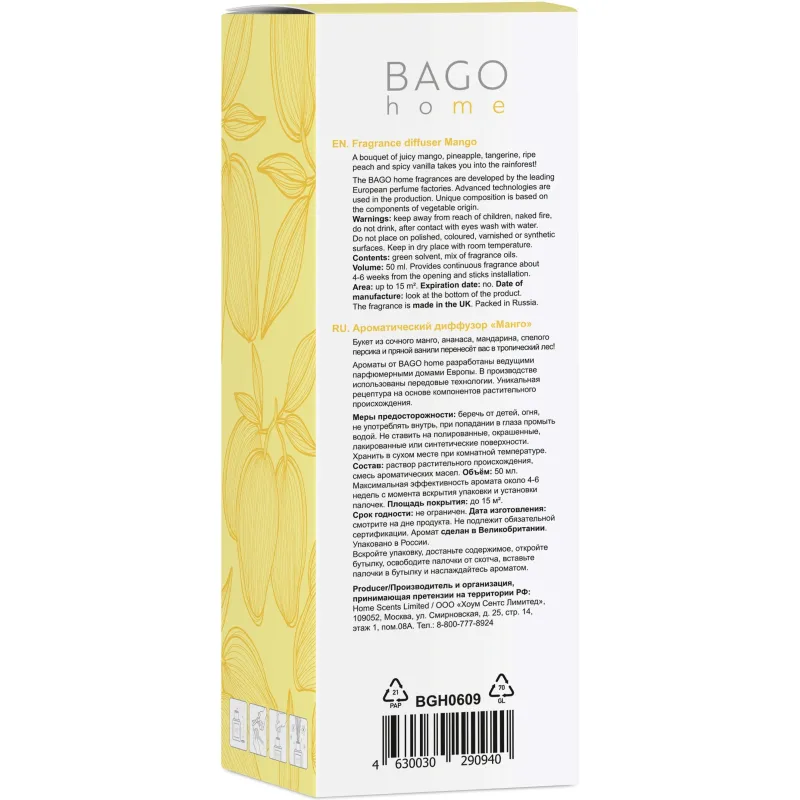 Bago home — это бренд ароматов для дома с европейским качеством. Главные ценности компании — создавать натуральные и экологически чистые ароматы для каждого дома. Огромная палитра ароматов, авторский дизайн, безопасный состав и контроль всего цикла производства — всё это делает компанию уникальной на международном рынке, где бренд Баго хоум знают и любят уже в 12 странах.