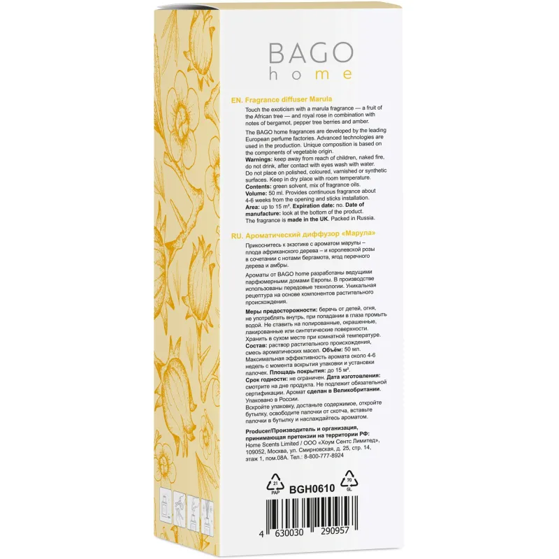 Bago home — это бренд ароматов для дома с европейским качеством. Главные ценности компании — создавать натуральные и экологически чистые ароматы для каждого дома. Огромная палитра ароматов, авторский дизайн, безопасный состав и контроль всего цикла производства — всё это делает компанию уникальной на международном рынке, где бренд Баго хоум знают и любят уже в 12 странах.
