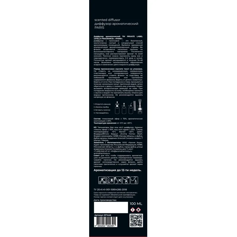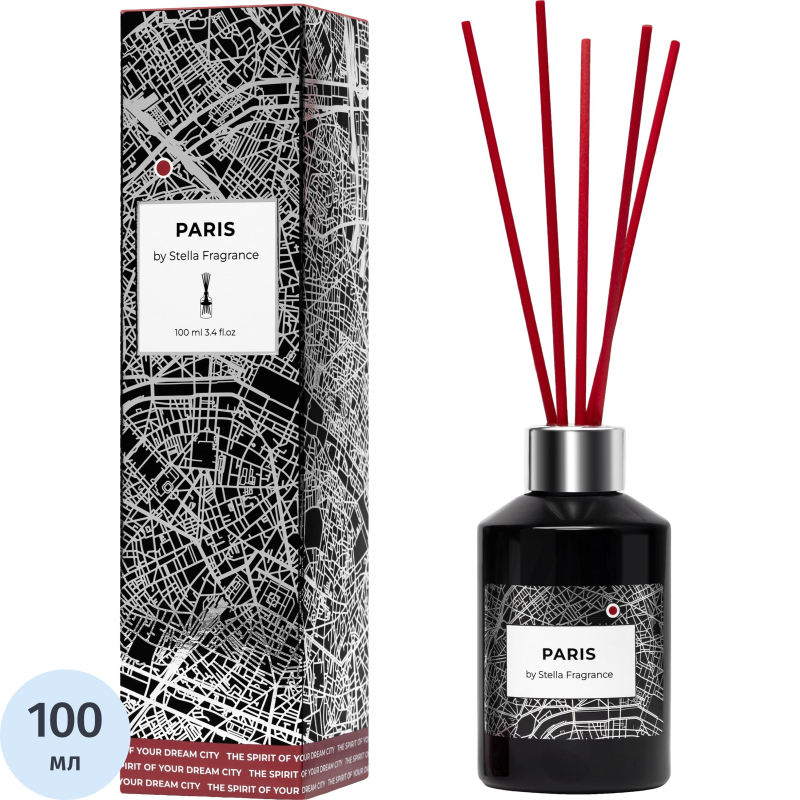 Комплектация: 1 флакон аромадиффузора Stella Fragrance Paris 100 мл, 5 палочек.