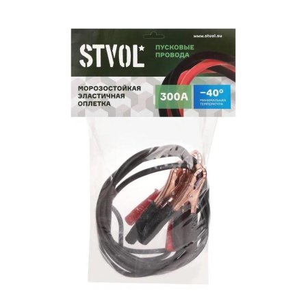 Провода прикуривания Stvol используются для запуска двигателя автомобиля с севшей АКБ. Изготовлены из сплава алюминия и меди и покрыты морозостойким термопластиком, который сохраняет свою эластичность даже в -40 градус.С. Провода прикуривания Stvol имеют длину 2 метра и пропускают ток силой до 300 ампер.