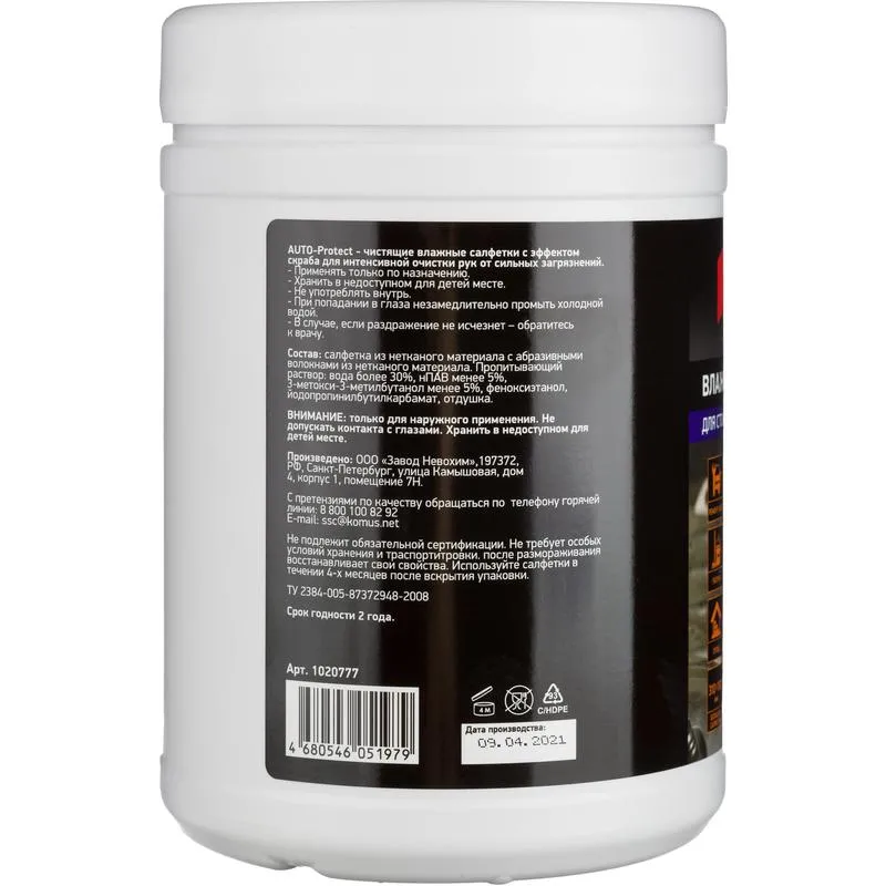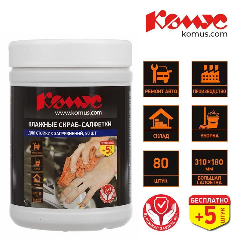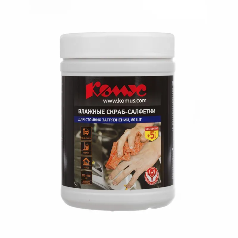 Удобны в применении, идеальны в условиях отсутствия воды. Рекомендуются для удаления стойких загрязнений с рук и поверхностей в автомобиле, офисе, на производстве и дома. Влажныескраб-салфетки отвечают современным санитарно-гигиеническим нормам, содержат смягчающие и увлажняющие компоненты, препятствующие раздражению кожи рук.
