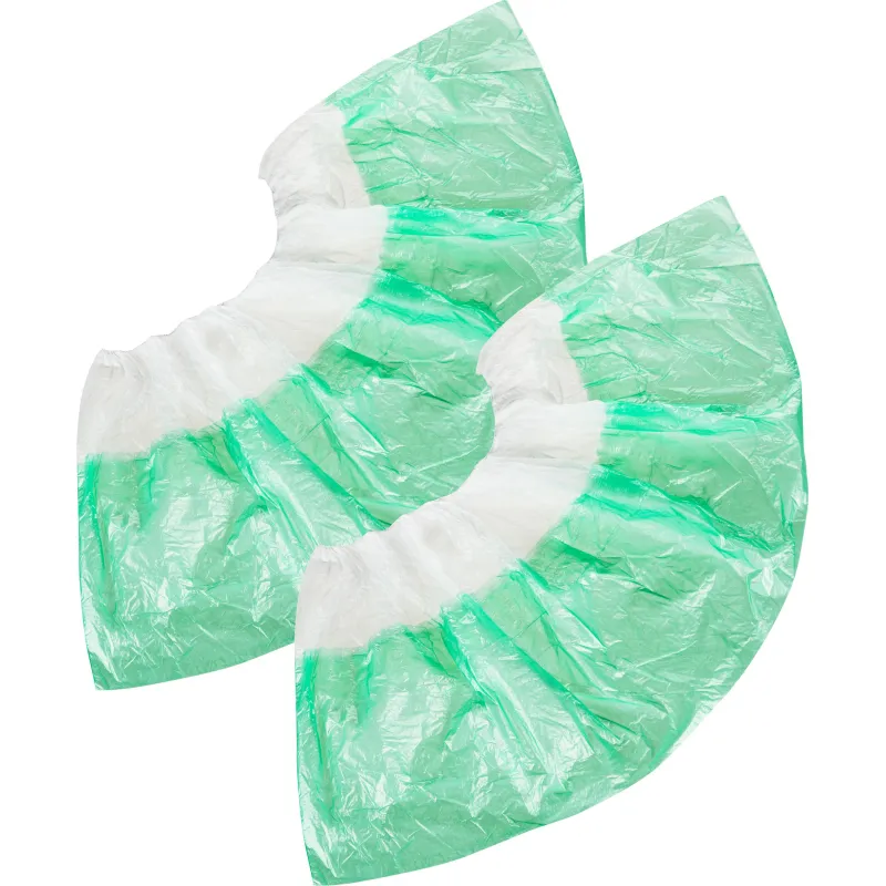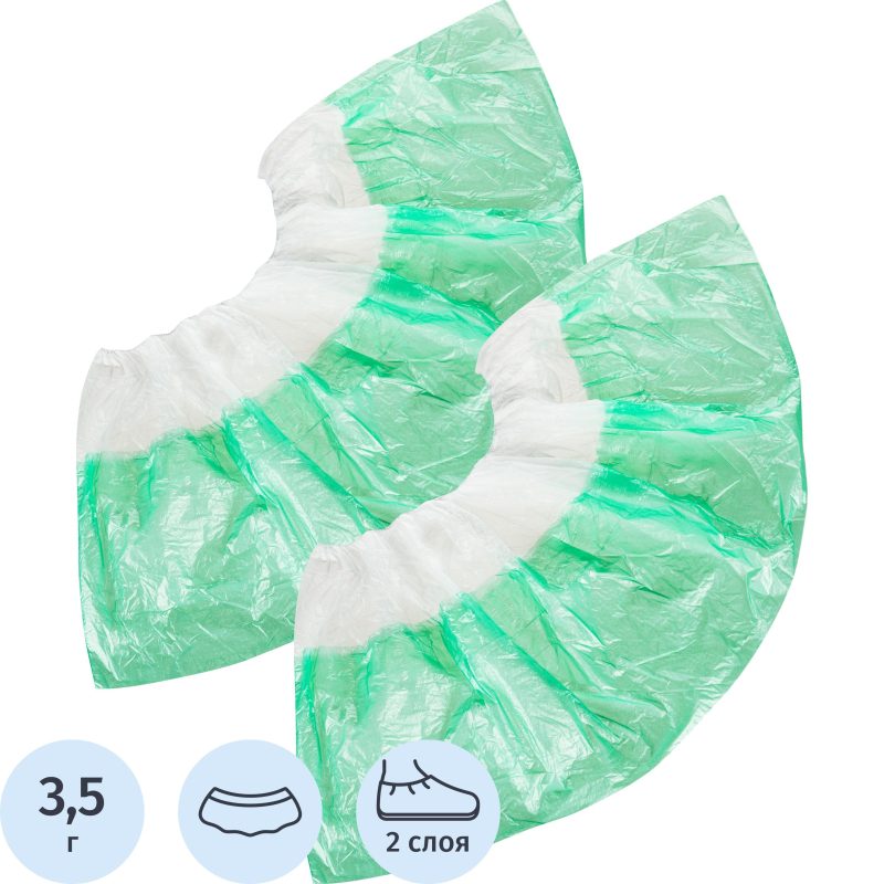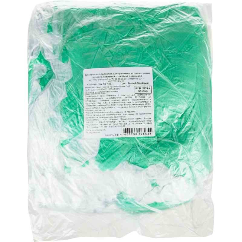 Бахилы одноразовые EleGreen полиэтиленовые двойные с усиленными торцевыми швами и надёжно закреплённой резинкой. Производятся из полиэтилена низкого давления (ПНД) толщиной 16 мкм (2 слоя по 8 мкм), текстурированные с эффектом антискольжения, вес пары 3.5 г, цвет бело-синий, в упаковке 50 пар.