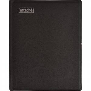 Бизнес-тетрадь на кольцах А5 формата изготовлена из переплетного картона толщиной 1,5 мм обтянутого ПВХ-пленкой черного цвета, тиснение фольгой логотипа Attache, кольцевой механизм на 4 кольца, блок сделан из офсета 60 г/кв.м белого цвета, линовка клетка, 160 листов. Есть возможность нанесения логотипа, тиснения. Диаметр колец позволяет увеличить количество листов на одну тетрадь. Размер блока — 165x215 мм.