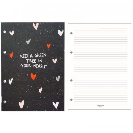 Блокнот подходит для разъемного кольцевого механизма с расстоянием между кольцами 42-62-42 мм. Обрез — белый. Без дополнительных элементов и разделителей.