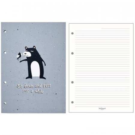Блокнот подходит для разъемного кольцевого механизма с расстоянием между кольцами 42-62-42 мм. Обрез — белый. Без дополнительных элементов и разделителей.