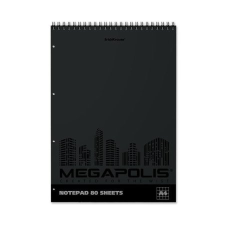 Бизнес-блокнот формата А4 (210x297 мм). Обложка из высококачественного мелованного картона плотностью 190 г/м2. Отделка обложки — твин-лак. Жесткая подложка 340 г/м2. В блоке 80 листов в клетку. Бумага офсетная плотностью 70 г/м2. Перфорация для подшивки. Микроперфорация для отрыва. Цвет линовки — синий. Тип скрепления — спираль.