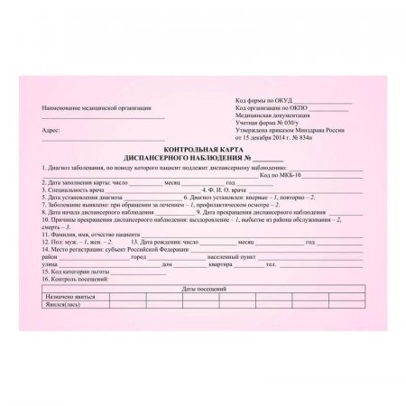 Контрольная карта диспансерного наблюдения заполняется абсолютно всеми амбулаторно-поликлиническими учреждениями (исключения составляют специализированные учреждения). Карта заполняется на всех больных, которые взяты под диспансерное наблюдение по причине их заболевания.