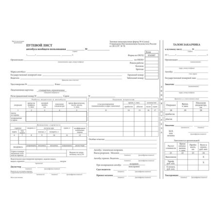 Бухгалтерский бланк Путевой лист автобуса не общего пользования формы 78. Изготовлен из офсетной бумаги плотностью 55 г/кв.м. 100 листов в книжке. Размер бланка 195?270 мм. Упакованы в термоусадочную пленку.Отсчет и запаковка бланков осуществляются на автоматическом оборудовании. В связи с этим, согласно имеющимся допускам оборудования, погрешность в количестве бланков в упаковке может составлять +/-3%.В путовом листе автобуса не общего пользования фиксируются сведения о пройденном километраже, указываются сведения о самом автобусе, времени выезда, возвращения, потраченные ГСМ и т. д.