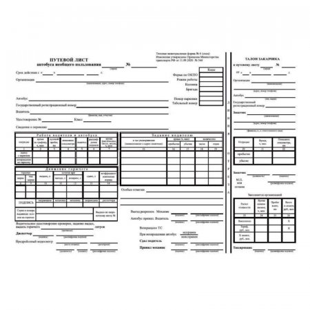 Путевой лист автобуса необщего пользования соответствует типовой межотраслевой форме № 6 (спец). Изменения утверждены Приказом Министерства транспорта РФ от 11.09.2020 № 368.