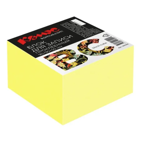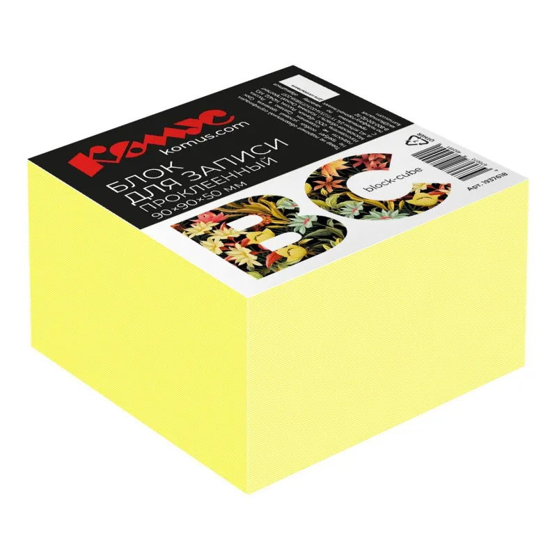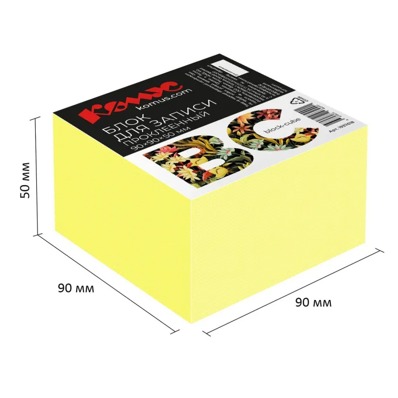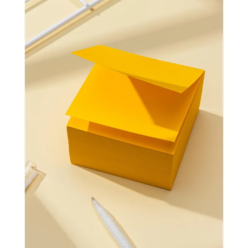 Блок высотой 5 см сложен из квадратных листов размером 9×9 см. Листы склеены между собой. Листы изготовлены из офсетной бумаги плотностью 80 г/кв.м. В блоке представлены листы солнечно-желтого цвета цвета. Блок для записей подходит для письма любыми типами ручек и карандашей. Благодаря высокой плотности листы не продавливаются при нажатии. Поставляется в термоусадочной пленке, защищающей блок при транспортировке.