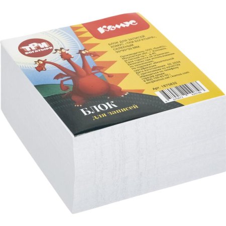 Блок для записей Комус предназначен для работы в офисе или дома. Будет полезен в использовании для рабочих процессов и повседневных задач, а также при проведении совещаний, обучений, мозговых штурмов, творческих работ. Идеально подходит для работников офиса, образовательных учреждений и др. Блок высотой 5 см сложен из квадратных листов размером 9×9 см. Листы склеены между собой. Листы изготовлены из высококачественной белой офсетной бумаги плотностью 100 г/м2 и белизной 100%. На листах нанесен рисунок Три богатыря. Повышенная плотность и белизны листов добавляет удобства в использовании. Блок для записей подходит для письма любыми типами ручек и карандашей. Благодаря высокой плотности листы не продавливаются при нажатии. Поставляется в термоусадочной пленке, защищающей блок при транспортировке. Для повышения удобства рекомендуется использование в пластиковых подставках и настольных органайзерах.