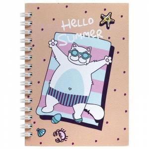 Блокнот Be Smart из коллекции Hello Summer А6 формата (102x142 мм) на спирали с ярким «летним» дизайном и расслабленным котиком на обложке.
