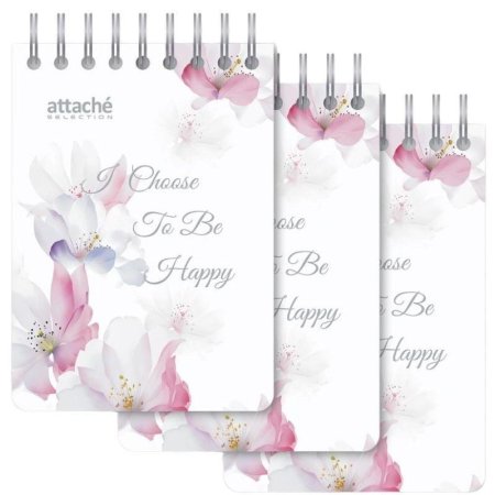 Блокнот Attache Selection Flower Dreams I Choose. Формат: А7. Размер: 75?110 мм. Разноцветная обложка выполнена из тактильно-приятного пластика. Содержит 80 листов (160 страниц) белой, офсетной бумаги в клетку. Бумага плотностью 65 г/кв.м белизной 100%. Евроспираль серебристого цвета. Хорошее совмещение и четкость. Подойдет для повседневного использования. Удобный размер. Блокнот можно поместить в карман, при необходимости достать и сделать пометку или запись. 3 штуки в упаковке.