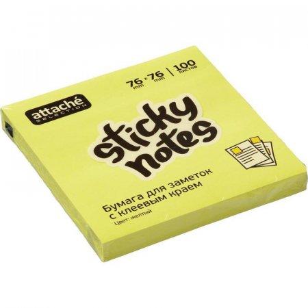 Бумага для заметок с клейким краем Attache. Размер — 76×76 мм, неоновая, желтого цвета. Плотность бумаги составляет 75 г/кв.м, клейкий слой — 20 Н/м. В упаковке 100 листов. После удаления бумаги на поверхности не остается следов клеевого состава, лист можно крепить повторно.