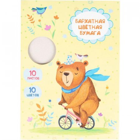 Цветная бархатная бумага 10 листов, 10 цветов, формат А4, плотность 140 г/кв.м. Внутренний блок — бархатная бумага. В наборе цвета: красный, синий, зеленый, черный, желтый, белый, оранжевый, коричневый, розовый, голубой. Упаковка — папка из мелованного картона с двумя клапанами. Рекомендуется детям от 3 лет.