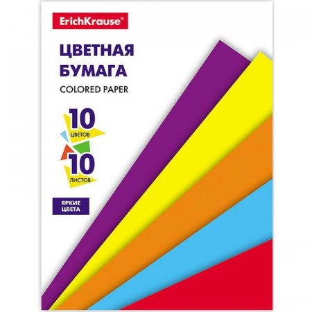 Цветная бумага немелованная формата А4 (203x280 мм). Яркие насыщенные цвета. 10 листов, 10 цветов. Плотность наполнения — 80 г/кв.м. Тип крепления — склейка. На внутренней стороне обложки приводятся инструкции по изготовлению поделок. Цвета: голубой, желтый, зеленый, коричневый, красный, оранжевый, розовый, синий, фиолетовый, черный.