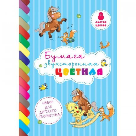 Двухсторонняя цветная бумага идеально подойдет для создания красочных аппликаций, оригами, изготовления открыток и поделок. Может использоваться для скрапбукинга, квиллинга и оформления подарков. В наборе представлены восемь самых востребованных ярких цветов двухсторонней бумаги на восьми листах А4 формата. Плотность: 48 г/кв.м. Обложка: мелованный картон, скрепление: скоба. Цвета: зеленый, коричневый, красный, желтый, синий, черный, фиолетовый, оранжевый.