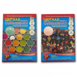 Цветная перламутровая самоклеящаяся бумага, 8 листов, 8 цветов, формат А4, плотность 190 г/кв.м. Внутренний блок выполнен из мелованной бумаги с клевым слоем. В наборе перламутровые цвета: серебряный, золотой, лиловый, пурпурный, зеленый, фиолетовый, оранжевый, желтый. Упаковка — папка из мелованного картона с двумя клапанами. Рекомендуется детям от 3 лет.