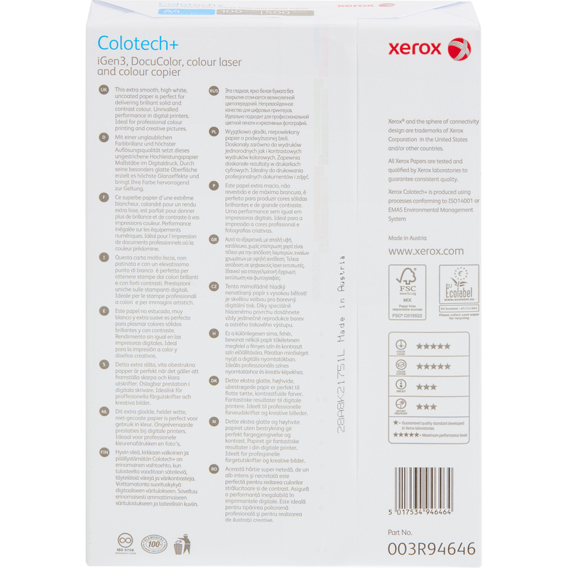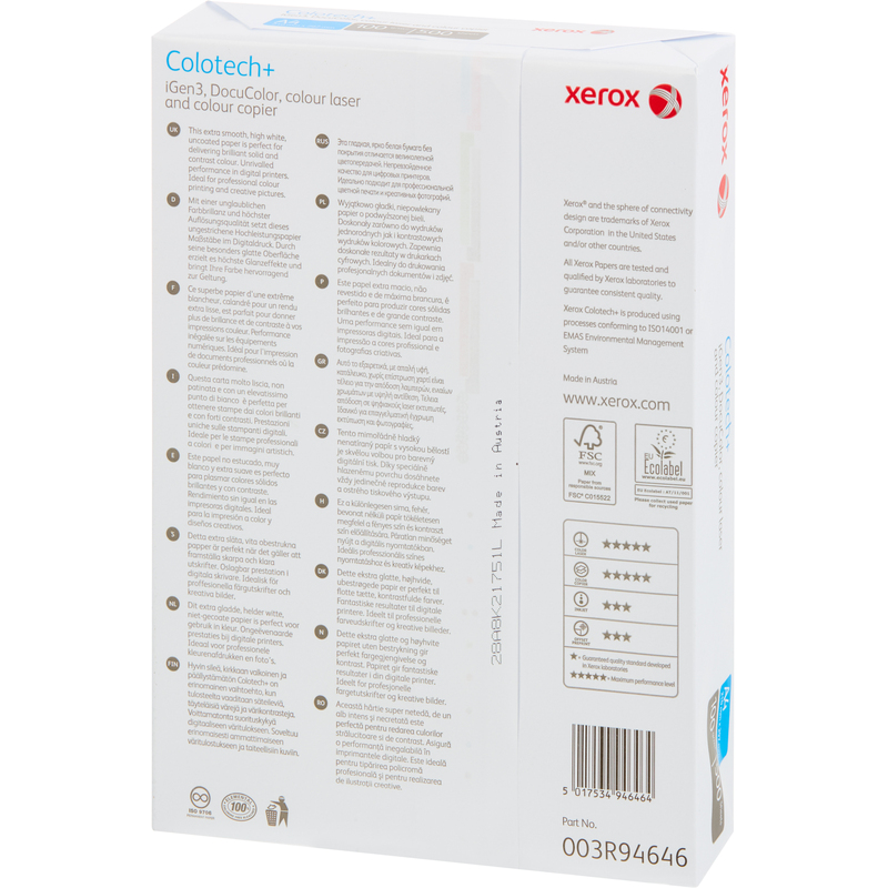 Суперкаландрированная бумага Xerox Colotech (без покрытия) формата A4 разработана для полноцветной лазерной печати, полностью соответствует высоким стандартам качества компании Xerox. Плотность бумаги составляет 100 г/кв.м. Артикул производителя: 003R94646 Страна-производитель: Австрия.