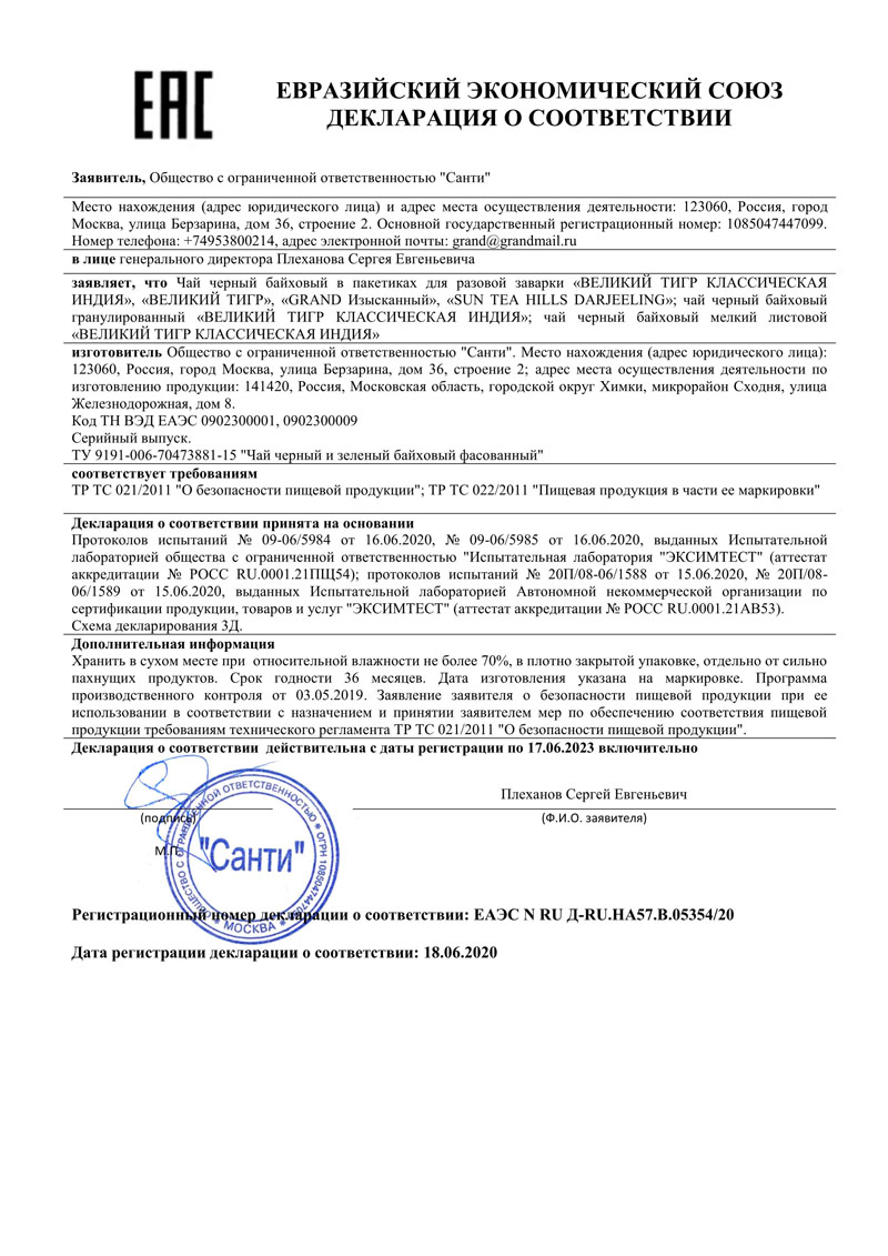Чай черный «Великий тигр». Отборный чай высшего сорта, собранный на лучших плантациях Южной и Северной Индии обладает насыщенным вкусом и ароматом.В упаковке содержится 100 пакетиков чая.Срок годности чая: 24 месяцаУсловия хранения: Хранить в сухом месте при относительной влажности не более 70%, в плотно закрытой упаковке, отдельно от сильнопахнущих продуктов. Температурный режим не установлен.Производитель: ООО «Санти»