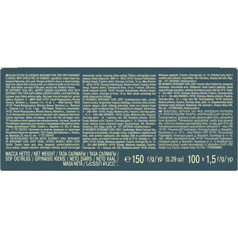 Состав: чай черный байховый цейлонский, ароматизатор бергамот, цедра цитрусовых.