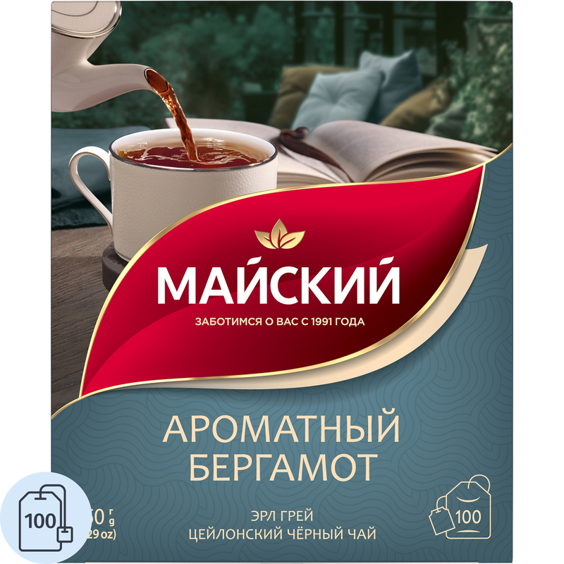 Чай черный Майский Ароматный Бергамот 100 пакетиков. Цейлонский черный чай с легкой благородной горчинкой бергамота и освежающим цветочным послевкусием, которое идеально дополняет и мягко балансирует цитрус.