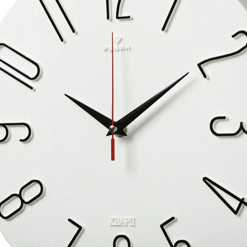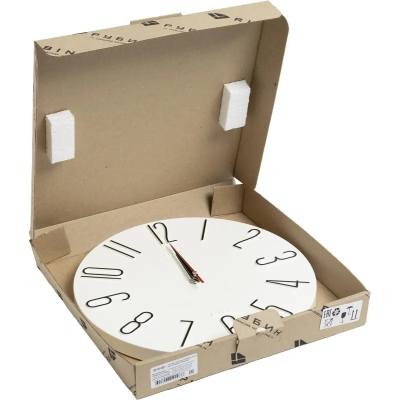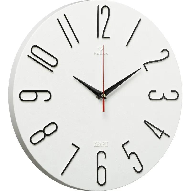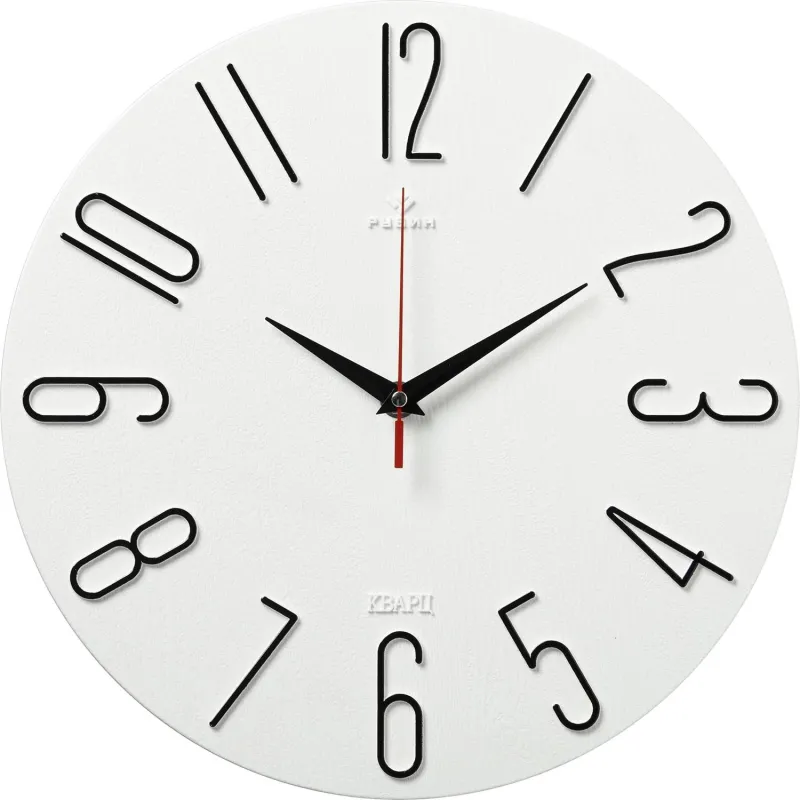Настенные часы «Рубин» 3010-001 — стильное решение для вашего интерьера. Круглый корпус изготовлен из АБС-пластика. Размер циферблата часов — 28.5×28.5 см, такой размер гармонично впишется в любую комнату. Циферблат белого цвета защищён стеклом, а чёрные арабские цифры обеспечивают лёгкость чтения времени. Механизм кварцевый, поэтому часы работают бесшумно и имеют плавный ход стрелок. Есть секундная стрелка. Для работы требуется всего одна батарейка типа АА, которая не включена в комплект. Производитель предоставляет гарантию на 12 месяцев.