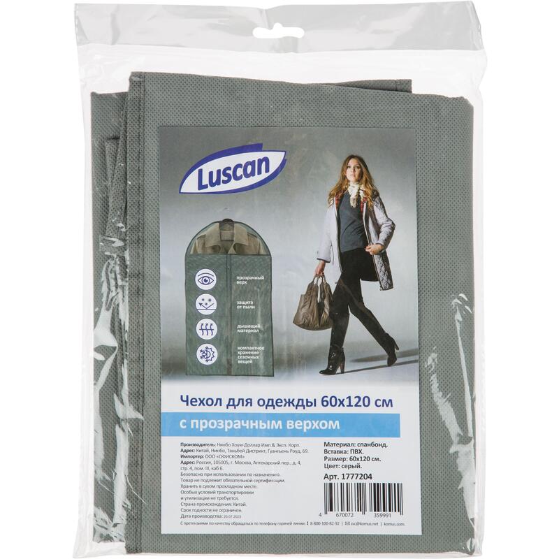Чехол для одежды марки Luscan с прозрачным верхом. Оптимальный выбор для хранения или перевозки костюмов, платьев, верхней одежды и других предметов гардероба. Вещь не помнется и не испачкается, будет защищена от влаги и пыли, сохранит презентабельный внешний вид. Чехол выполнен из воздухопроницаемого нетканого материала, а вставка из прочного полиэтилена. Серый цвет препятствует проникновению ультрафиолетовых лучей, которые могут вызвать пожелтение изделия. Чехлы сшиты таким образом, что позволяют также хранить и объемные верхние вещи (шубы, пальто, пуховики т. п.).Состав ткани: спанбонд.Размер чехла: 60×120 см.Количество чехлов в упаковке: 1 шт.