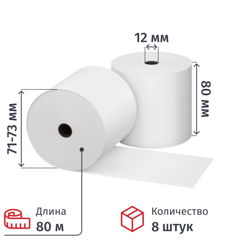 Чековая лента изготовлена из термобумаги. Бумажное полотно с наружным термослоем имеет ширину 80 мм и общую длину 80 метров. Диаметр намотки — 71-73 мм, диаметр втулки — 12 мм. Поставляются в термоусадочной плёнке и гофрокоробах. Ролики для термопечати используются в кассовых аппаратах и калькуляторах со встроенным или внешним термопринтером.