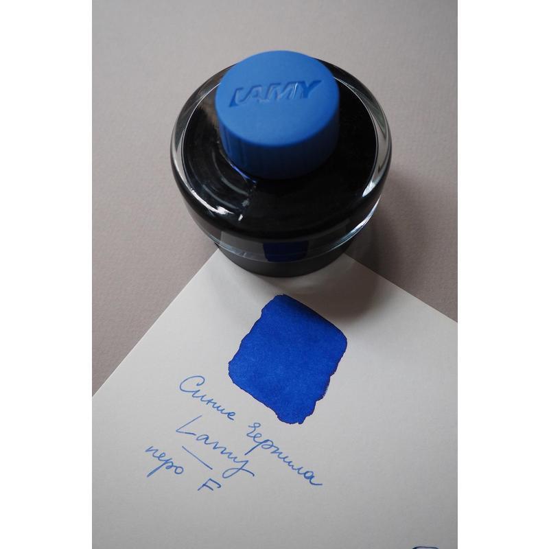 Чернила Lamy для перьевых ручек на водной основе в стеклянном флаконе с пластиковым основанием. В основании находится рулон промокательной бумаги для удаления капель чернил с пишущего узла ручки после заправки. На дне флакона имеется углубление для сбора остатков чернил для удобной заправки и использования до последней капли. Чернила предназначены для заправки перьевых ручек с помощью конвертера, а также для поршневых перьевых ручек. Цвет: синий.