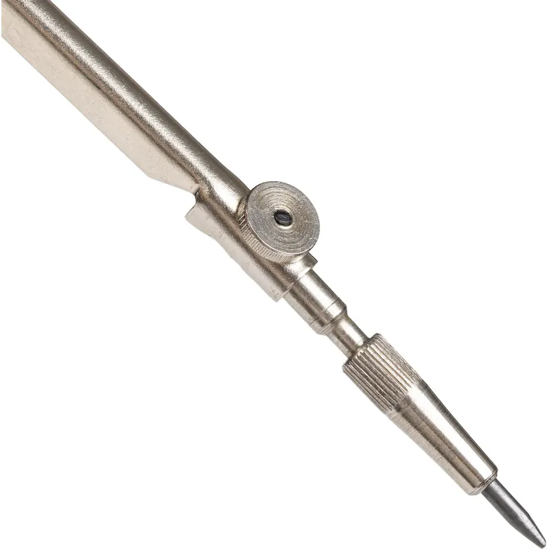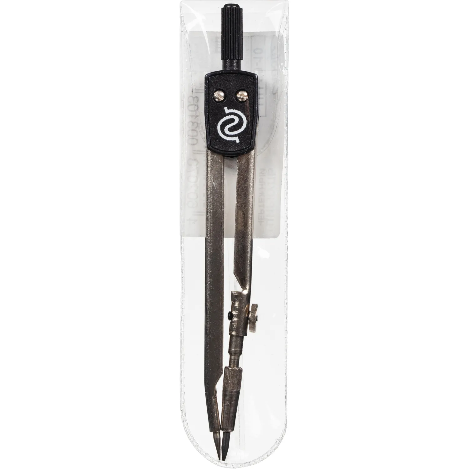 Циркуль предназначен для выполнения точных окружностей и дуг в чертежах и графических построениях. Подходит для школьников, студентов и специалистов, работающих с технической документацией. Изделие выполнено из прочного металла с никелированным покрытием и латунной вставкой в пишущей части. Циркуль имеет длину 125 мм и жёсткую, несгибаемую штангу, что обеспечивает точность построений и устойчивость при использовании. Корпус выполнен в серебристом цвете. Модель не оснащена защитным колпачком и системой стоп-фиксации. Поставляется в удобном чехле, который защищает инструмент при хранении и транспортировке.