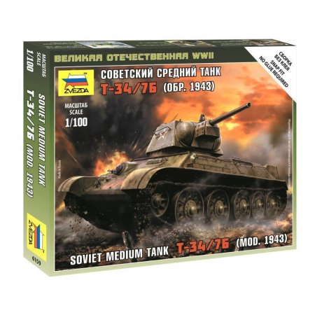 Сборная модель легендарного советского танка Т-34/76 обр. 1943 года в масштабе 1/100. Благодаря использованию при разработке модели трехмерных технологий, очертания оригинала в точности воспроизведены в миниатюре. Детали модели рассчитаны таким образом, чтобы максимально упростить процедуру сборки. При этом, для сборки модели не требуется клей — детали отлично стыкуются «на щелчок». Вы сможете не только пополнить этой моделью вашу коллекцию миниатюрной бронетехники, но и использовать ее в настольной военно-тактической игре «Великая Отечественная». На игровом поле данная модель отображает подразделение советских танков. Историческая справка: К 1943 году советские конструкторы сумели не только устранить большинство конструктивных недостатков, присущих танку Т-34, но и значительно упростить его производство. Именно эта модификация знаменитой «тридцатьчетверки» участвовала в сражении на Курской дуге в 1943 году и в освобождении Европы в 1944-1945 годах. Набор деталей из пластмассы для сборки одной модели танка. Состав набора: 1 неокрашенный танк, флаг отряда, инструкция по сборке . Карточку с игровыми характеристиками отряда вы найдете в разделе «Схема сборки и окраски». Сборка осуществляется без использования клея.