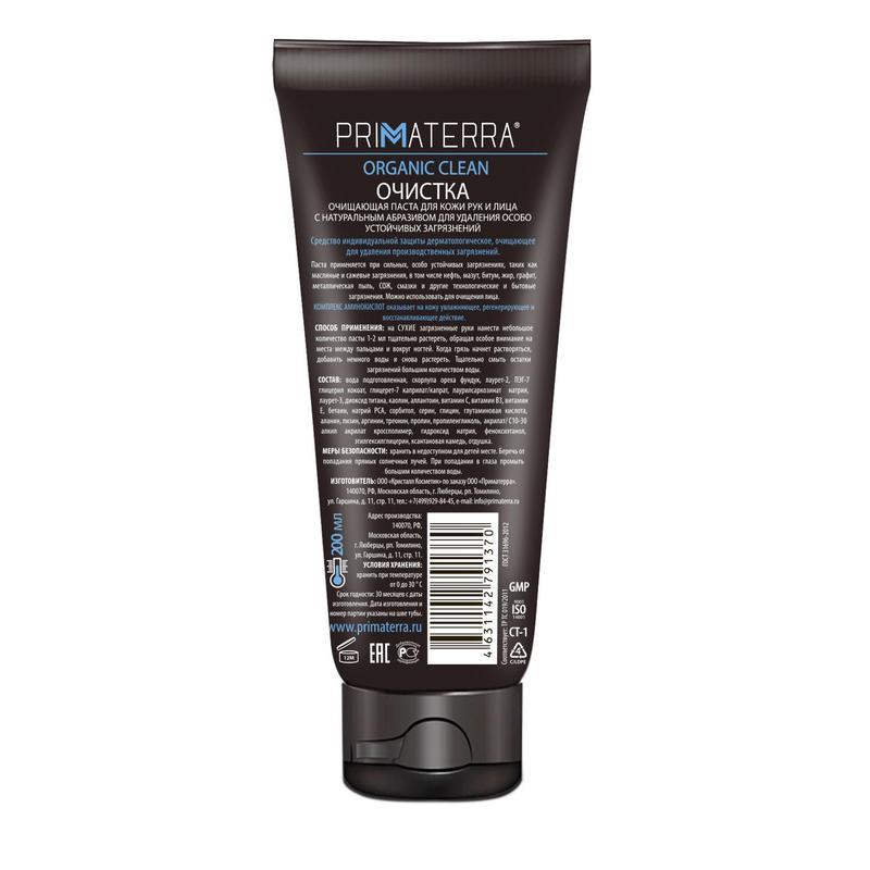 Паста очищающая Primaterra Organic Clean с натуральными абразивами для очистки рук 200 мл применяется при сильных, особо устойчивых загрязнениях, таких как масляные и сажевые загрязнения, в том числе нефть, мазут, битум, жир, графит, металлическая пыль, СОЗ, смазки и другие технологические и бытовые загрязнения. Предназначена для очистки кожи от сильных загрязнений различных типов. В качестве скрабирующего компонента в состав пасты входит измельченная скорлупа ореха фундук — мягкий косметический абразив. За счет входящих в состав современных поверхностно-активных веществ (ПАВ), паста обладает высокой моющей способностью, хорошо переносима кожей,т. к. ее уровень pH приближен к нейтральному. В данной пасте содержится комплекс анионных (аПАВ) и неионогенных (нПАВ) ПАВ; ПАВ с низким и высокимГидрофильно-липофильным балансом (ГЛБ), что обеспечивает очищение от максимального спектра загрязнений. В пасте содержится природныйминерал-каолин, обладающий высокой адсорбирующей способностью. Паста обладает смягчающим и увлажняющим действием, благодаря входящему в состав комплексу аминокислот Prodew 400. Витамины В3, С, Е и аллантоин обеспечивают антиоксидантное и регенерирующее действие. Содержит толерантные к коже комплексы ПАВов, которые обеспечивают эффективную очистку от сильных загрязнений. Подходит для очистки рук и лица. Можно использовать людям с чувствительной кожей. Не содержит: органических растворителей, SLES, кислот, минерального масла, спирта, силиконов. Органический абразив — косточка ореха фундук, не травмирует поверхность кожи. Содержит комплекс аминокислот, который: 1. Восстанавливает и сохраняет собственные защитные свойства кожи. 2. Составляет основу натурального увлажняющего фактора (НУФ; NMF). 3. Поддерживает должную пластичность кожи, защищая ее от повреждений. 4. Обеспечивает нормальную функцию гидролитических ферментов в процессе обновления клеток. Расход 1–2 мл на одно применение. ТР ТС 019/2011, ГОСТ 31460–2012, СТ 1 Условия хранения: избегать попадания прямых солнечных лучей. Срок годности 30 месяцев с даты изготовления/12 месяцев с момента вскрытия.