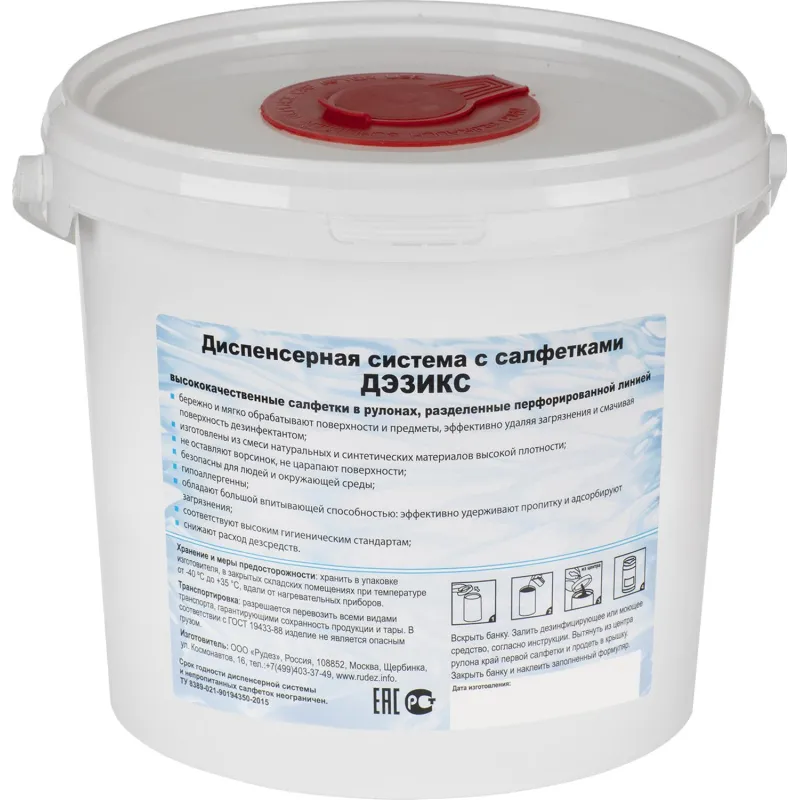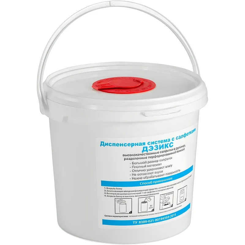 Состав — диспенсер (ведро или банка) со специальным закрывающимся клапаном для извлечения салфеток (размеры зависят от диспенсера), наклейка-формуляр.