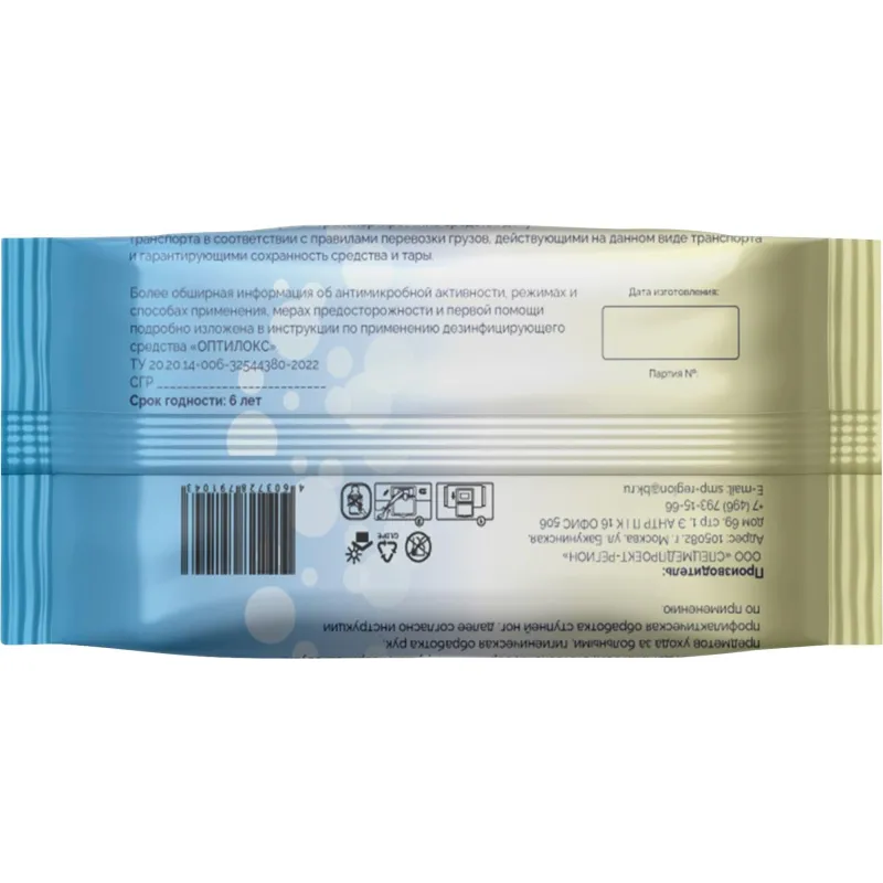 Готовые к применению салфетки «Оптилокс» 135×185 мм из плотного безворсового нетканого материла спанлейс, пропитанные композицией из пропилового спирта (1-пропанол) массой 28%, ЧАС, аминов и гуанидинов. Для экспресс-дезинфекции небольших по площади поверхностей, оборудования и предметов, датчиков диагностического оборудования (УЗИ, ЭКГ и т.п.), стоматологических инструментов, наконечников, предметов ухода за больными и других медицинских изделий, кроме восприимчивых к обработке спиртами.
