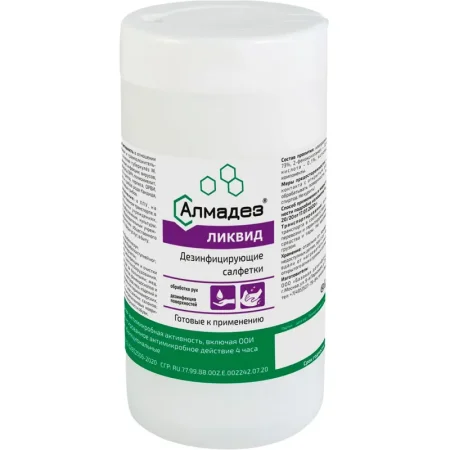 Дезинфицирующие салфетки «Алмадез-ликвид» представляют собой готовые к применению салфетки из белого нетканого материала, равномерно пропитанные дезинфицирующим средством «Алмадез-ликвид».