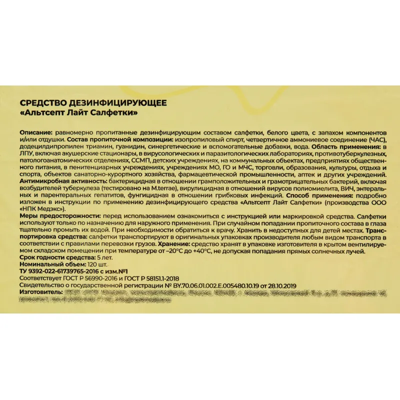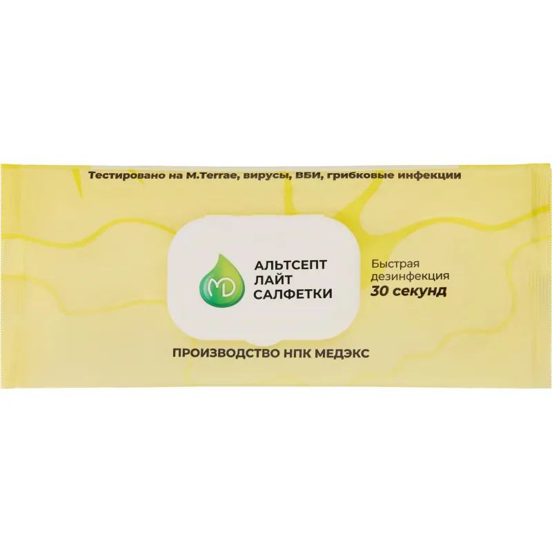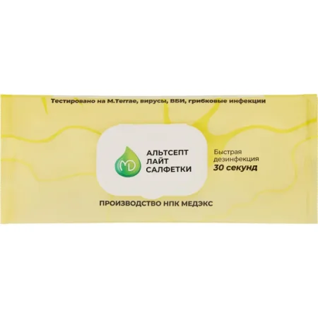 Салфетки влажные «Альтсепт Лайт» дезинфицирующие предназначены для: гигиенической обработки рук персонала различных организаций и учреждений (в том числе детских), очистки и дезинфекции различных поверхностей, предметов мебели, поверхностей медицинских приборов и оборудования, медицинских инструментов, узлов и деталей оборудования, жёсткой мебели, первичного снятия загрязнений с неповреждённых кожных покровов, санитарной обработки кожных покровов, обработки ступней ног и внутренней поверхности обуви.