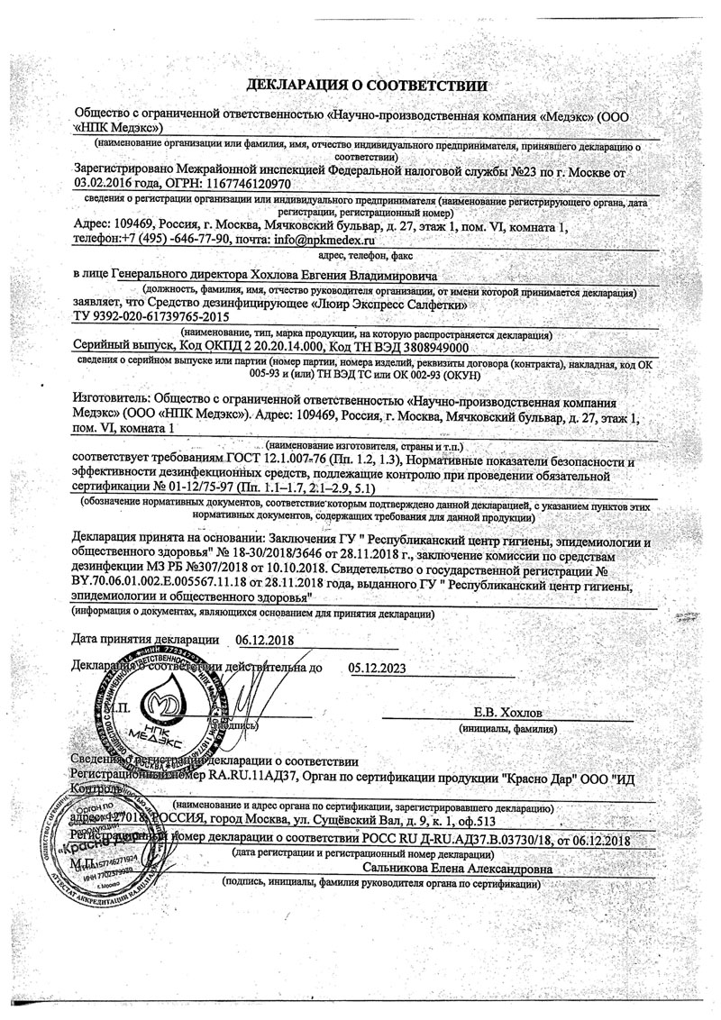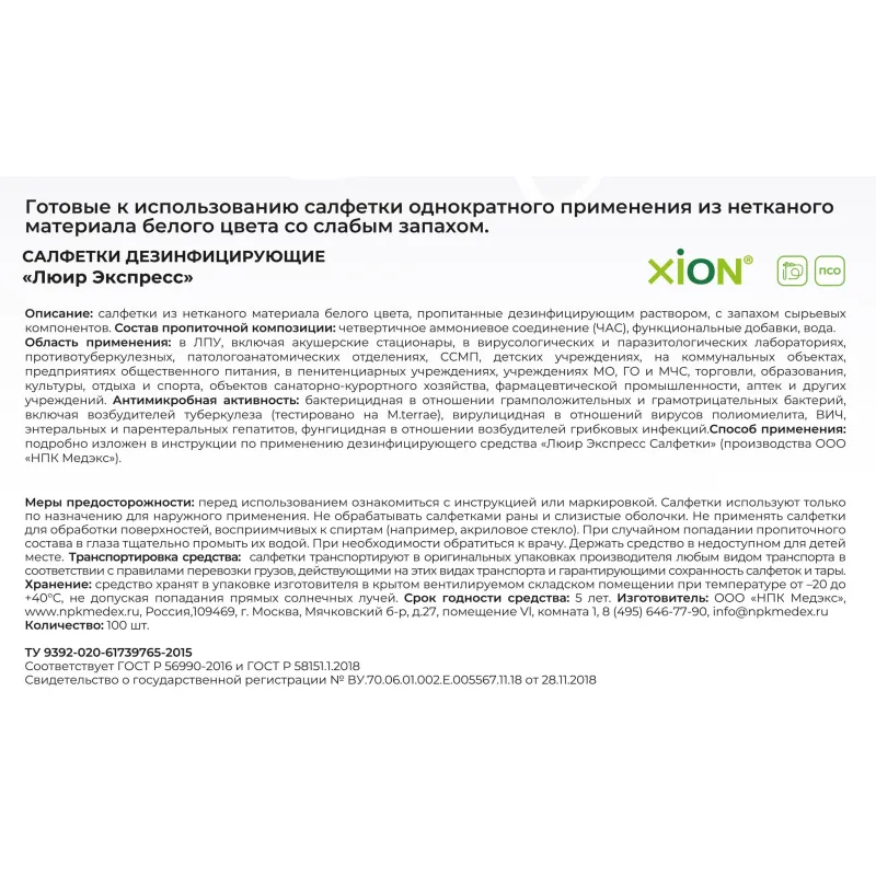 Пропиточный состав салфетки содержит четвертичное аммониевое соединение (ЧАС) — 0,95%±0,25, а также функциональные добавки и воду. рН пропиточного состава средства —7±1,5. Масса пропиточного состава не менее 3 г на салфетку.