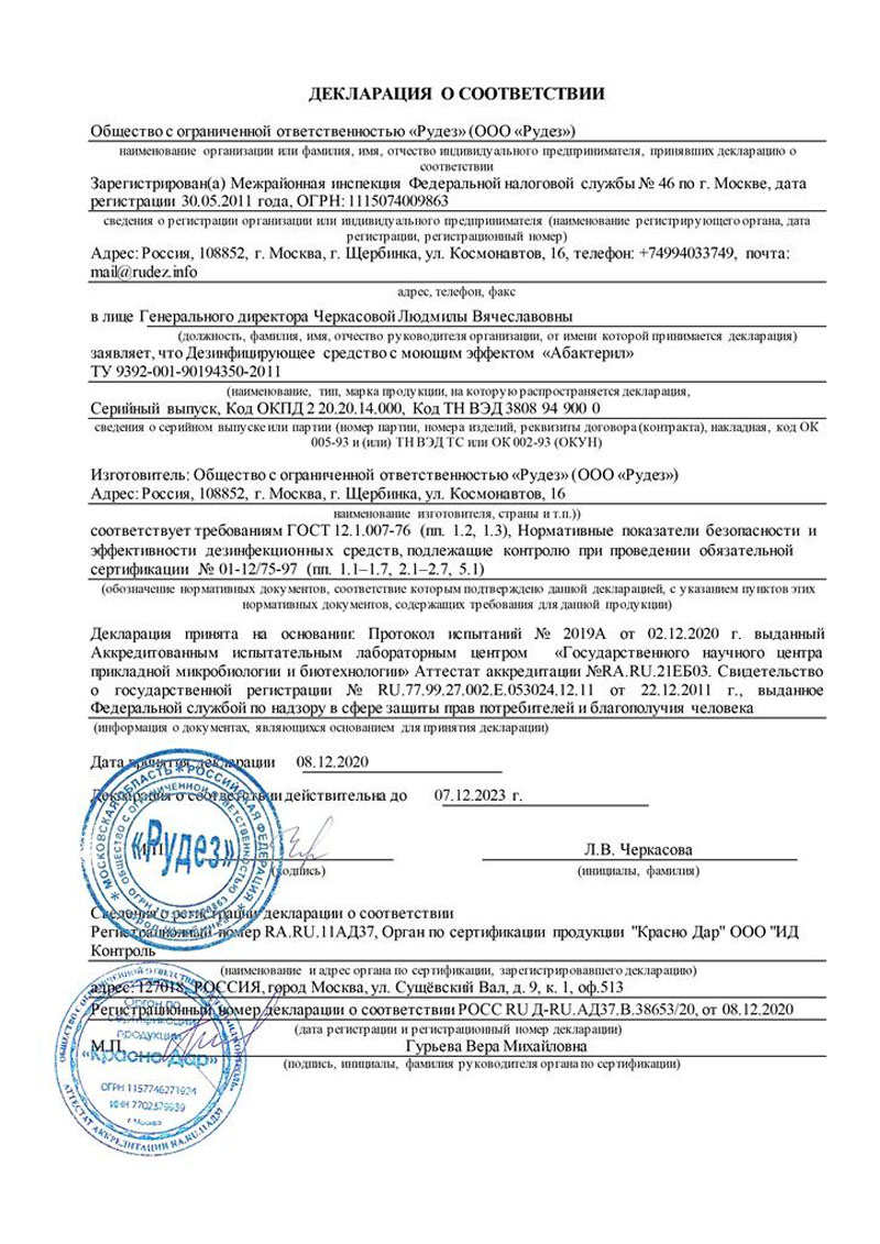 Химический состав дезсредства: ЧАС, третичный амин, гуанидин, поверхностно-активные вещества (ПАВ).