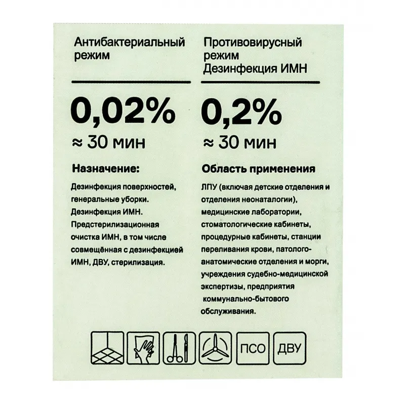 Сфера применения: роддома, палаты новорожденных, отделения неонаталогии, кювезы, эндоскопические отделения, анестезиологическое оборудование и детали наркозно-дыхательной аппаратуры, клинические, микробиологические и другие лаборатории, стоматологические инструменты, оттиски, заготовки, слюноотсосы, плевательницы, пищеблоки ЛПУ.