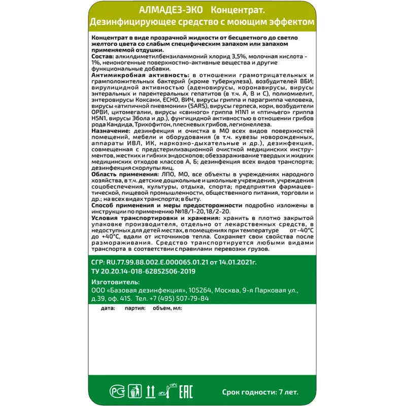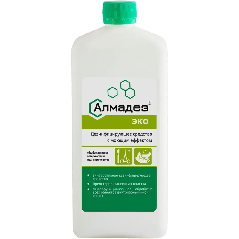Дезинфицирующее средство «Алмадез-эко» представляет собой прозрачную жидкость от бесцветного до светло желтого цвета со слабым специфическим запахом или запахом применяемой отдушки.