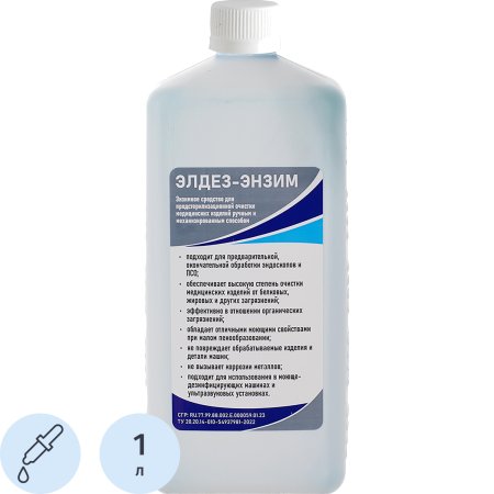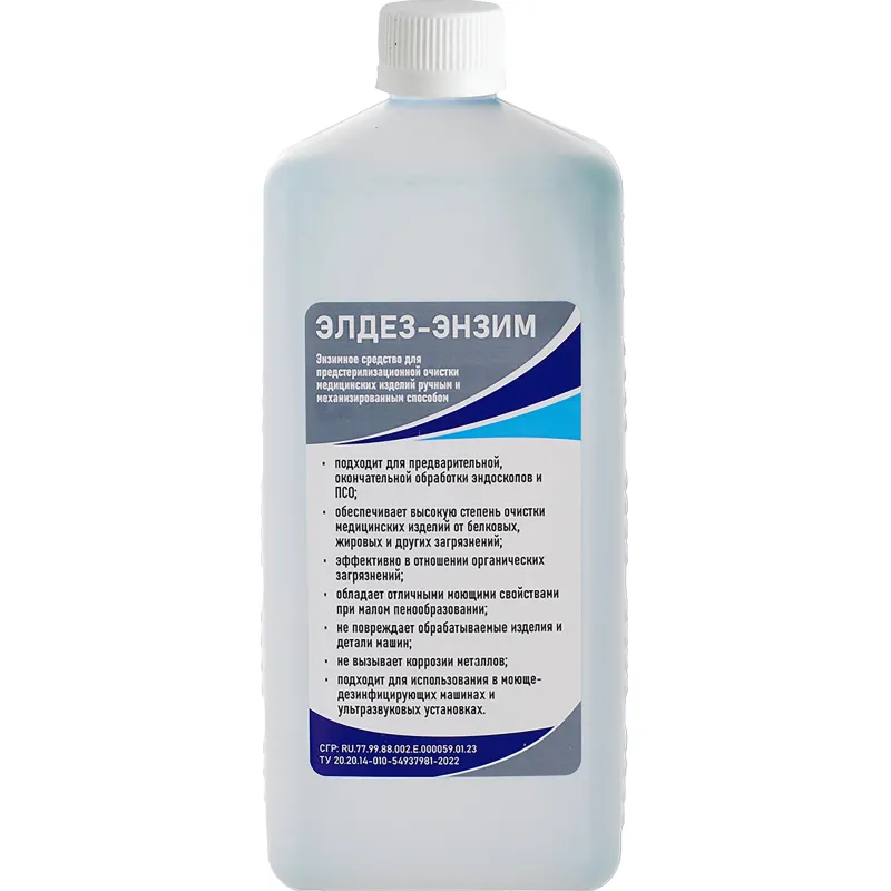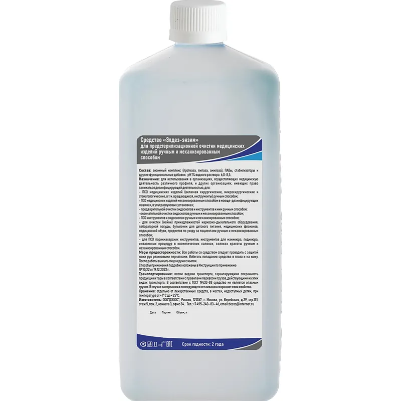 Средство «Элдез-энзим» представляет собой прозрачную жидкость от голубого до синего цвета со слабым специфическим запахом или запахом отдушки. Содержит энзимный комплекс (протеаза, липаза, амилаза) в качестве действующих веществ, а также поверхностно-активные вещества (ПАВы), стабилизаторы и другие функциональные добавки. Показатель активности водородных ионов (рН) 1% водного раствора 6,0- 8,5.