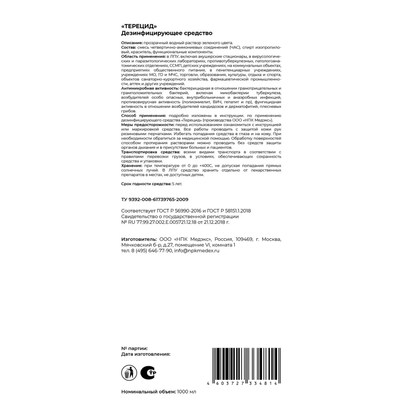 Дезинфицирующее средство «Терецид» 1 л (концентрат).