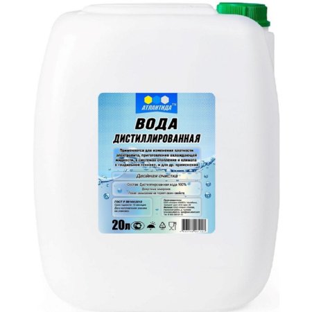 Вода дистиллированная Атлантида 20 л проходит многоступенчатую очистку. По своим качественным показателям соответствует требованиям ГОСТ 58144-2018 (имеет сертификат соответствия). Широко применяется в бытовых и медицинских целях, а также при разведении концентратов охлаждающих жидкостей, теплоносителей, для корректировки электролитов.