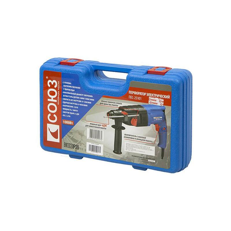 Перфоратор Союз ПЕС-25101 — универсальный трехрежимный перфоратор бытового назначения. Отличительная особенность модели — компактность. Небольшие габаритные размеры и масса инструмента способствуют эффективности его применения в условиях ограниченного пространства, либо при высотных работах. Модель имеет продуманную эргономику: прорезиненная противоскользящая накладка основной рукояти и возможность установки дополнительной рукояти в любом угловом положении способствуют надежности хвата и лучшему контролю, размещенный непосредственно под пальцами флажковый переключатель реверса гарантирует быструю смену направления вращения оснастки, исключая лишние движения рукой. Предусмотрена фиксация клавиши пуска — дополнительное подспорье при непрерывном использовании. Модель оснащена 1000 Вт электромотором и вакуумно-компрессионным механизмом с энергией удара — 4.0 Дж — это позволяет уверенно бурить отверстия диаметром до 24 мм в материалах различной твердости. Перфоратор имеет три режима работы: сверление, сверление с ударом, либо режим удара. Смена режимов происходит поворотом специального переключателя. Помимо, трех рабочих режимов предусмотрен еще один дополнительный, дающий возможность установки долота в любом угловом положении. Для безопасности пользователя в перфораторе установлена предохранительная кулачковая муфта — она позволяет избежать обратного удара в случае заклинивания оснастки, а также страхует от повреждений сам инструмент. Для удобства хранения и транспортировки перфоратор комплектуется штатным пластмассовым кейсом.Назначение: для эффективного бурения отверстий в бетоне / кирпиче, сверления различных материалов (используется переходник-адаптер с SDS+ на резьбу под патрон), легких демонтажных работ, размешивания ЛКМ и других строительных смесей в небольших объемах при условии установки соответствующей оснастки. Внешний вид и/или характеристики товара могут быть изменены производителем в соответствии с производственным процессом.