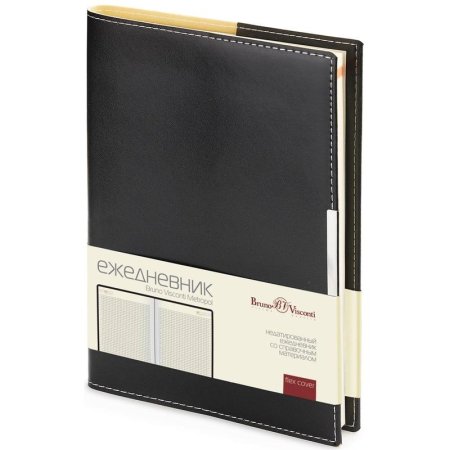 Ежедневник недатированный Bruno Visconti, цвет черный. Коллекция Metropol. Формата А5, размер изделия — 143×216 мм. Функциональный ежедневник обладает запоминающимся дизайном: гибкая обложка из высококачественного переплетного материала по периметру подчеркнута контрастной строчкой белыми нитками, ляссе в цвет обложки. Стиль и функциональность — качества, наиболее ценимые в современном мире. Этим качествам полностью соответствует серия Metropol — высококачественный материал обложки, модный форм-фактор, стильный металлический шильдик, сменный блок делают ежедневники и еженедельники этой серии прекрасным компаньоном современного городского профессионала. Блок: недатированный, 136 листов (272 страницы), сделанных из бежевой бумаги плотностью 70-90 г/кв.м., в клетку. На 18 первых страницах размещена справочная информация с ценными сведениями из разных областей: часовые пояса, аэропорты Европы, телефонные коды, размеры одежды, формат бумаги).
