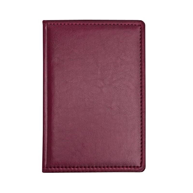 Ежедневник недатированный, 100×150 мм. Формат: А6. Однотонная обложка из высококачественного переплетного материала бордового цвета, имитирующего натуральную кожу, с поролоном. Гладкая фактура с легким блеском. По периметру отделочная строчка в цвет материала. Возможно нанесение логотипа на обложку любым способом тиснения. Блок: офсет плотностью 70-90 г/кв.м., 320 страниц, блок в 2 краски, перфорация уголка, ляссе серебристого цвета. Содержит информационно-справочный блок: личные данные, праздники, междугородные телефонные коды городов России, важные телефоны г. Москвы, важные телефоны г. Санкт-Петербурга, международные размеры одежды, знаки зодиака, штриховой код, информация по странам, справочная информация (меры длины, температура, международные форматы бумаги), цифровые коды ГИБДД, планы на год. В конце вставка — для заметок.